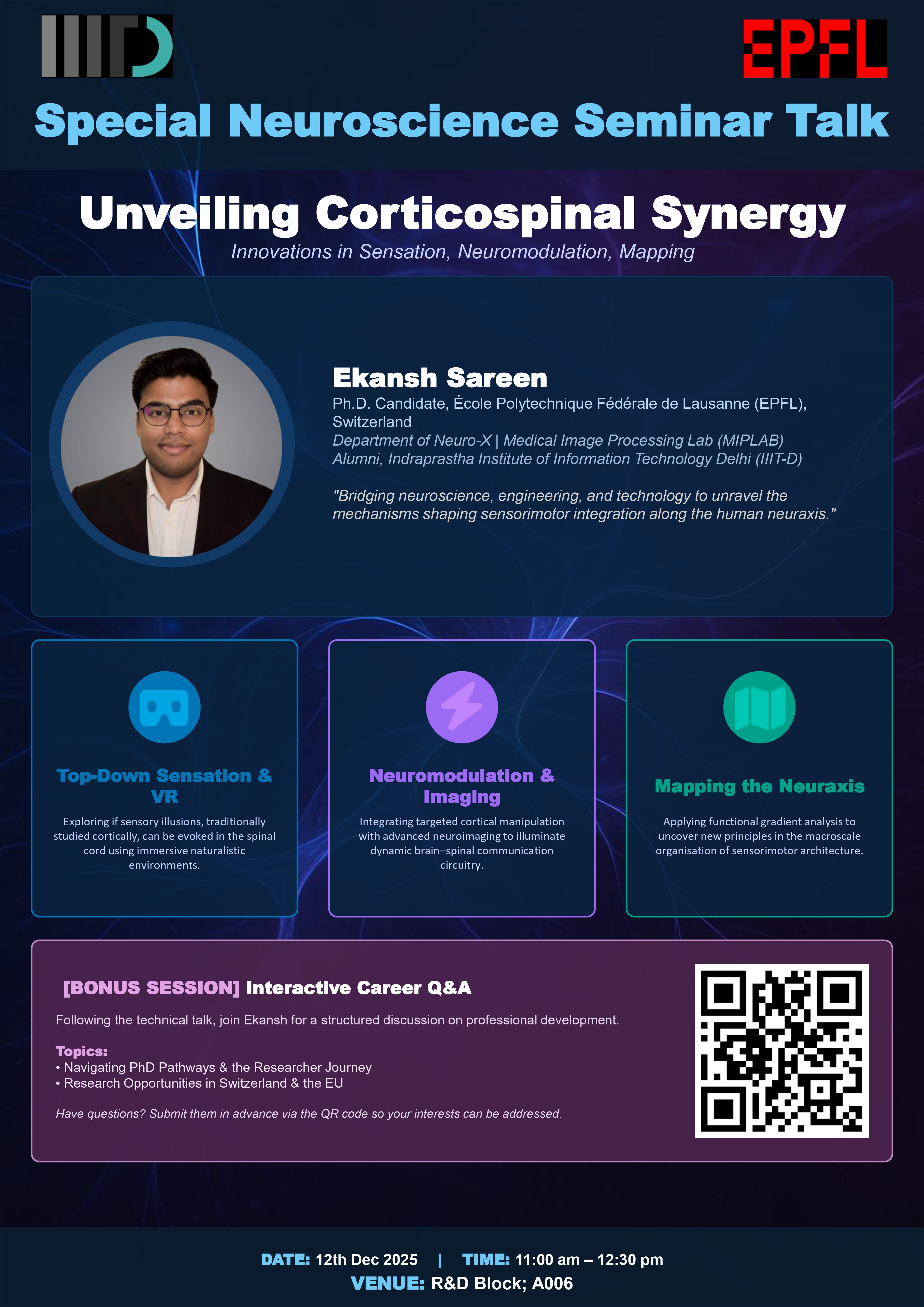 - » The ECE Department is organizing a Special Neuroscience Seminar Talk by Mr. Ekansh Sareen, Ph.D. Candidate, Department of Neuro-X, École Polytechnique Fédérale de Lausanne (EPFL), Switzerland, on 12th December 2025 at 11:00 AM -12:30 PM. Read more...